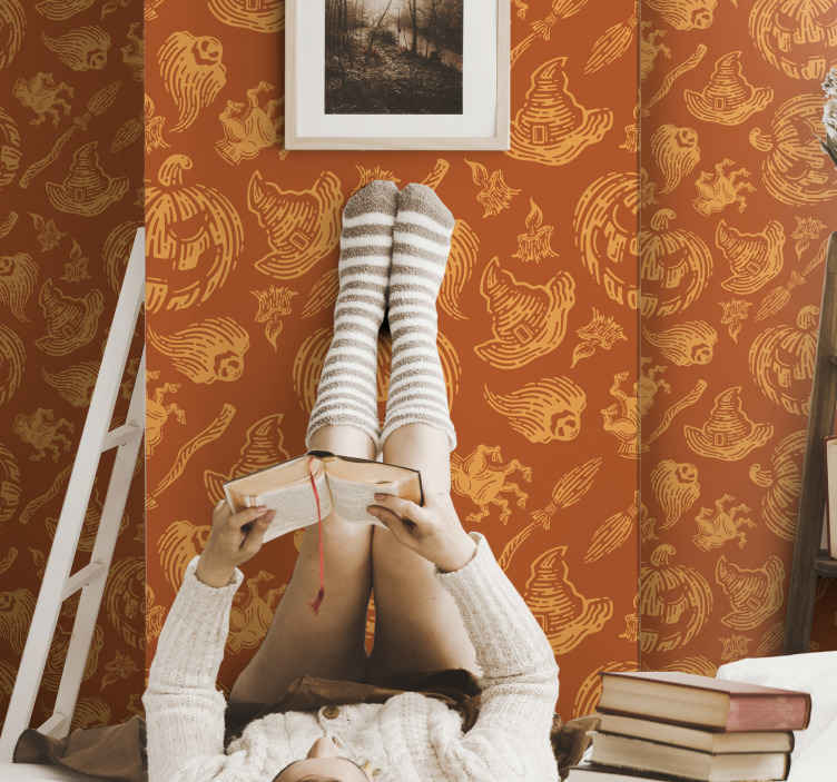 这款墙纸设计融合了南瓜、雕刻、万圣节和秋天的图案,为您的装饰带来了喜庆的节日氛围。 它是一款完美的圣诞节和秋季意象墙纸,为您的家居增添了一丝鬼魅的装饰。