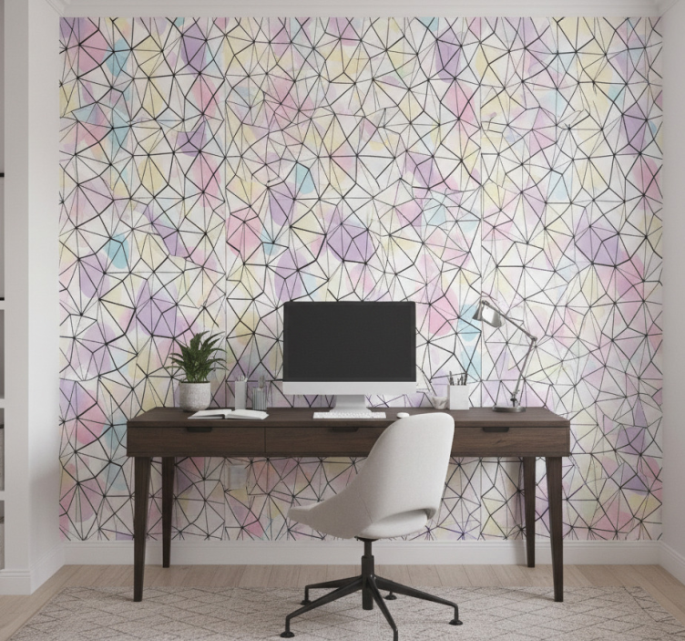 复杂的三角形和多边形创造出迷人的设计,柔和的粉色、紫色和蓝色与自然色调交织在一起。相互连接的线条形成马赛克般的外观,邀请人们探索,使其成为任何装饰的引人注目的补充。