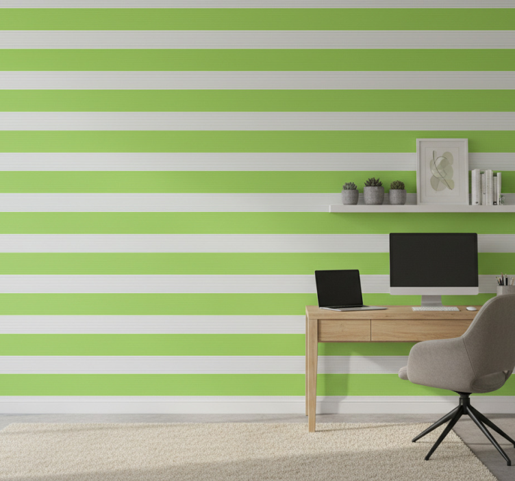鲜绿色和白色的条纹营造出活泼而清新的视觉效果。横向线条的宽度各异,增添了深度和趣味。这个设计唤起了自然的感觉,令人联想到郁郁葱葱的风景,充满活力与现代优雅。非常适合需要一点明亮感的空间。